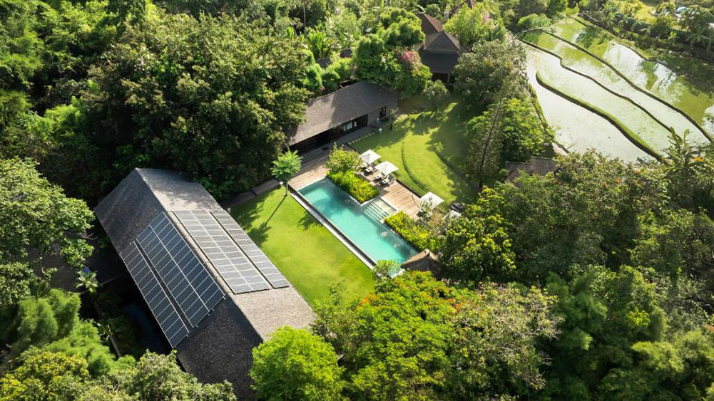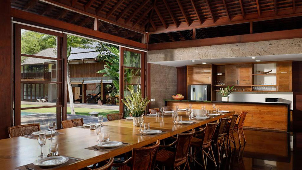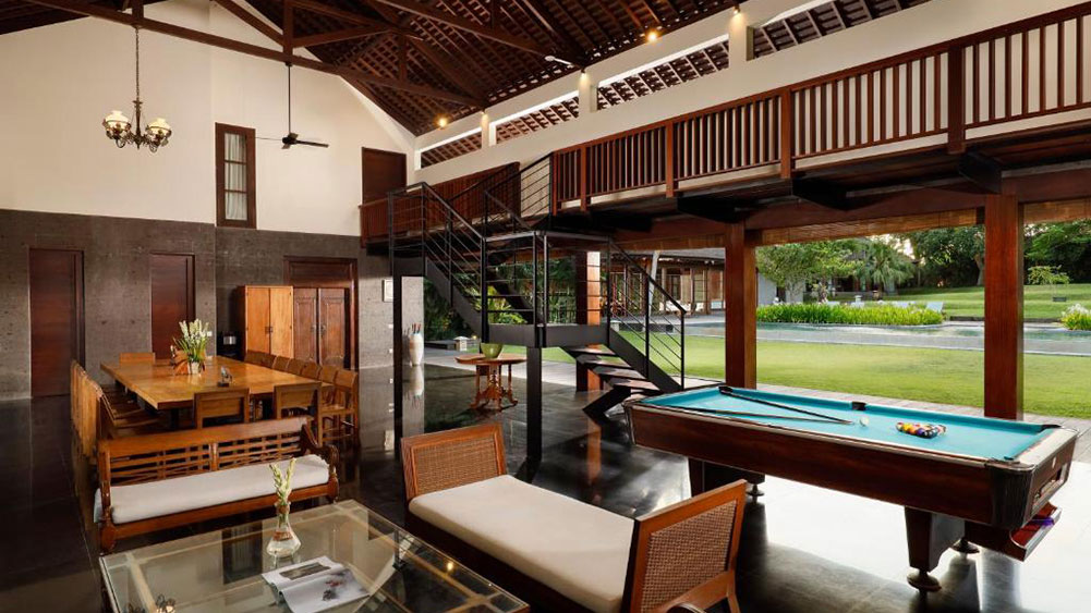 le beds. The ground level bedrooms have direct access to the swimming pool. Two master bedrooms, in individual pavilions, have queen-sized beds. These bedrooms open out to the terraced garden. All bedrooms have dedicated bathrooms with rain showers. Some of these bedrooms, though, also have freestanding bathtubs.